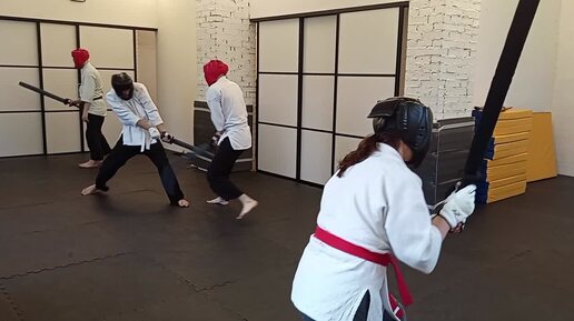 Завершение тренировки по тянбара бой. две пары четыре человека, соревнуются в нападении защите.