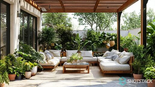 Уютное патио с мебелью и зеленью — мечта для отдыха 🌿🪑✨