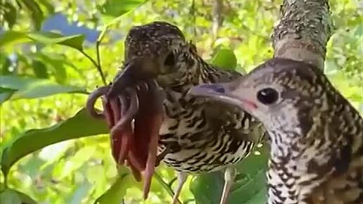 Самка дрозда показывает самцу, как кормить птенцов
