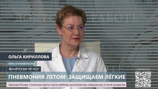 Пневмония летом: защищаем легкие. Ольга КИРИЛЛОВА , врач - пульмонолог ФГБУ "ОБП" рассказывает в эфире программы "Доктор на работе".