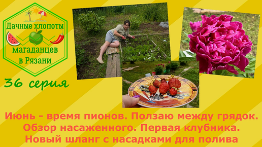 Время пионов.Ползаю между грядок.Обзор насаженного.Первая клубника.Новый шланг с насадками.36 серия