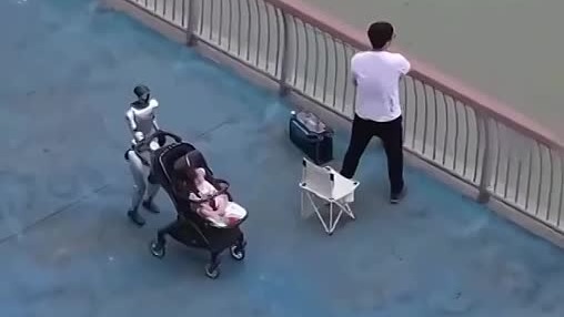 Папа ловит рыбу, пока робот ходит с коляской. Китай 2025 год.