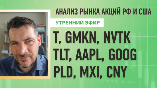Анализ рынка акций РФ и США/ T, GMKN, NVTK, TLT, AAPL, GOOG/ PLD, MXI, CNY
