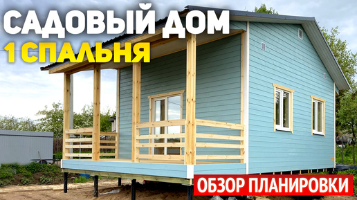 Проект одноэтажного каркасного дачного дома 6х6 с террасой: 1 спальня, кухня-гостиная, ванная, тамбур