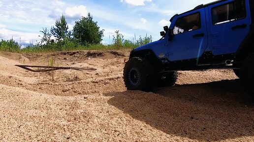 Радиоуправляемый Jeep Wrangler JK Rubicon едет по пересечённой местности.