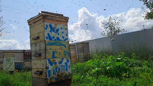 Вышедший рой долго висел на дереве, потом улетел куда-то далеко и вернулся домой через час