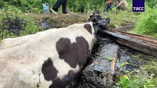 В Еврейской автономной области сотрудники МЧС спасли корову из битумной ямы