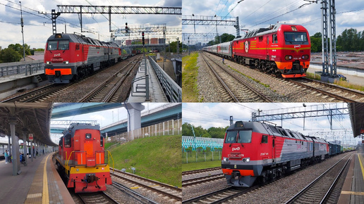 Движение поездов по 3-му пути МЦК. ЭП2К в фирменном окрасе Санкт-Петербурга, два грузовых с тепловозами 2ТЭ25Км и ТЭМ18ДМ резервом.