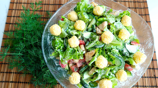 Салат с курицей овощами и сырными шариками