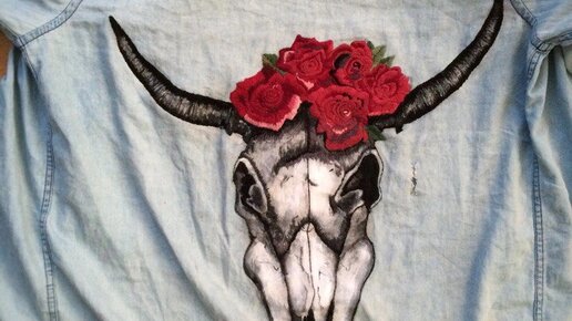 Рисунок черепа с вышивкой на джинсовой рубашке