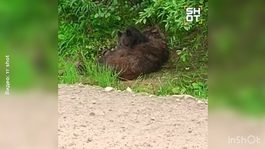 ДО СЛЕЗ! Медвежонок пытается «разбудить» мать на трассе в Иркутской области. Малыш сутки не отходит от медведицы.