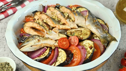 Рыба с овощами и чесночной заливкой в духовке. Секрет легкого летнего ужина в духовке.