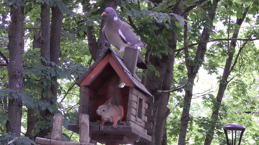 Деревянная кормушка. Птица и белка