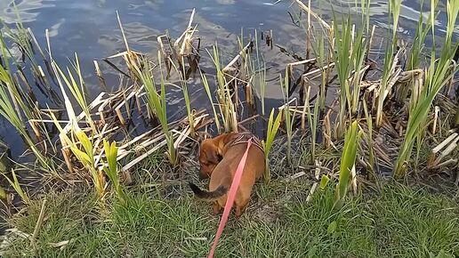 Такса Алиса гуляет на пруду