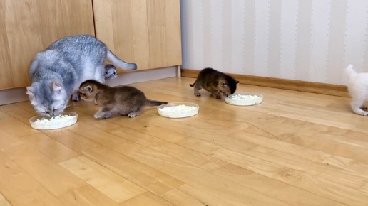 Первый прикорм для котят, им двадцать семь дней. Отварное яичко с молочком.