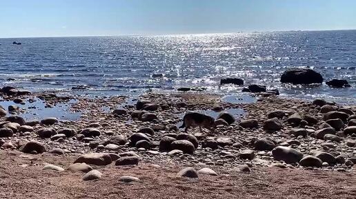 -Собака, песок, шум воды, ветерок-