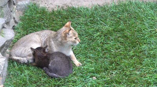 Камышовая кошка с котенком на зеленом газоне. 14.07.2025