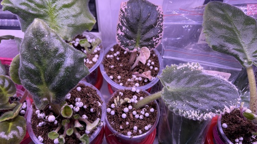 Пересадка листиков фиалок с детками из зип-пакетов в стаканчики • фитильный полив
