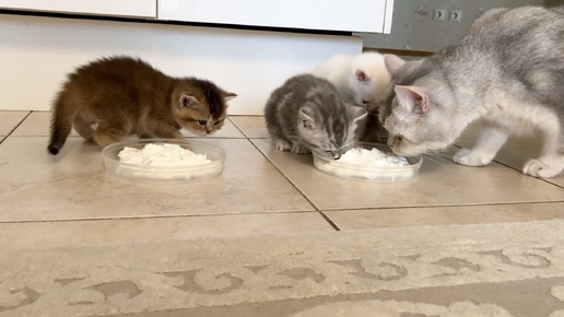 Кушаем мягкий творог. Котятам тридцать дней.