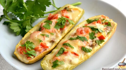 Аппетитное плаванье. Лодочки из кабачков с куриным фаршем, грибами и помидорами