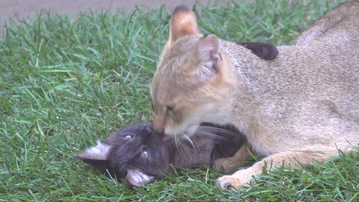 Камышовая кошка с котенком на зеленом газоне отдыхают. 14.07.2025