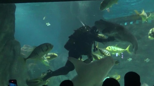 Аквалангист в аквариуме с акулами и скатами