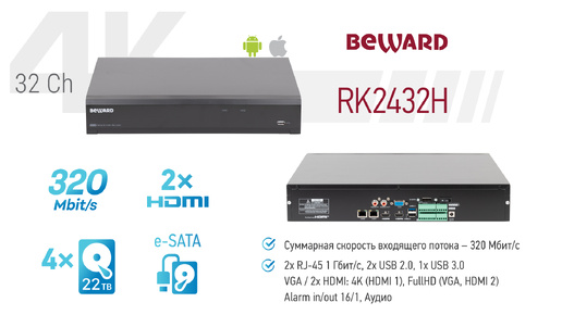 Новый 32-канальный IP-видеорегистратор BEWARD RK2432H: камеры до 12 Мп, до 320 Мбит/с, ONVIF, P2P