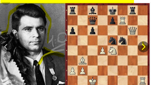 Борис Спасский весело жертвует белую ладью Науму Рашковскому с красивой победой на 25 ходу шахматной игры (Москва, 1973, 1-0)