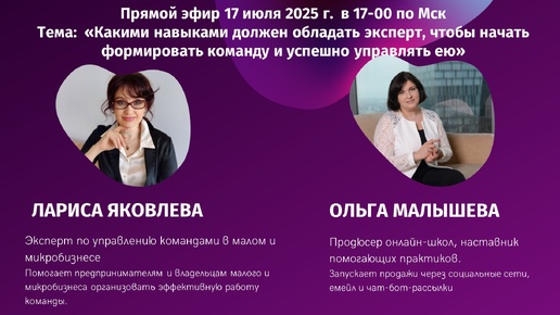 Видеозапись прямого эфира с Л. Яковлевой "Какими навыками должен обладать эксперт, чтобы начать формировать команду и успешно управлять ею"