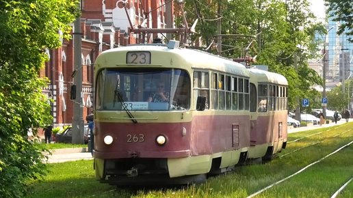 Трамвай Екатеринбурга Tatra T3SU СМЕ борт. №263/262 маршрут 23 следует по улице Челюскинцев