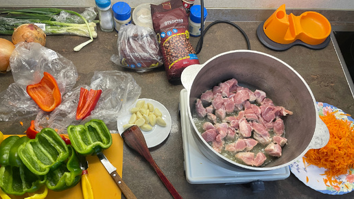 Гречка со свининой и овощами в казане на электроплитке.