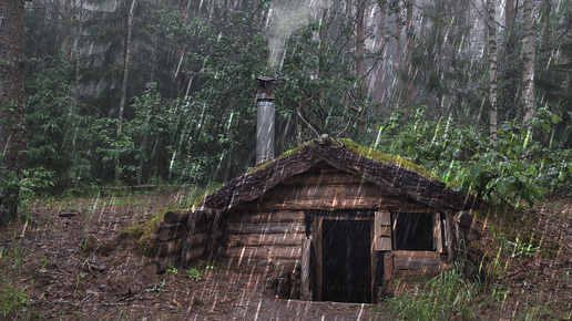 Укрылся в ЗЕМЛЯНКЕ от ливня и непогоды. Питаюсь дарами леса.
