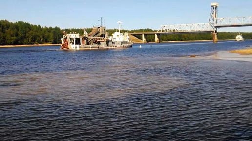 Далее: Буксир-толкач "Капитан Шитов" проводит вверх по реке 4 рейдовых буксира. Мост через реку развели