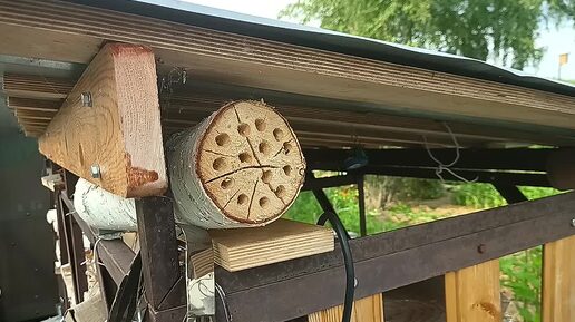 Пчелы листорезы в количестве 5-7 штук организовали жилище в чурбаке выполненном для осмий. Данный вид кое-где занесен уже в красную книгу.