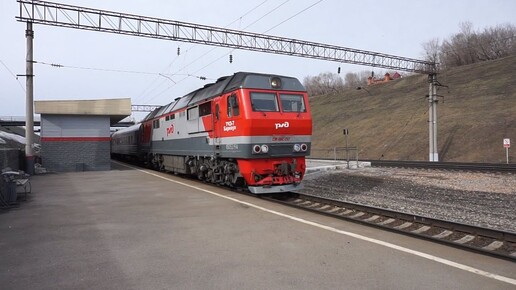 Тепловоз ТЭП70БС-257 с поездом "Калина красная" и пролёт турбовинтового самолёта.