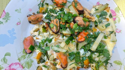 Завтрак из кабачка с мидиями. Быстро и вкусно.