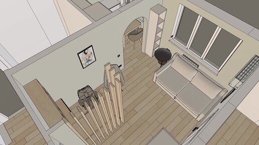 Комната с реечной перегородкой, отделяющей рабочую зону, и смежная кухня. 3D модель в SketchUp