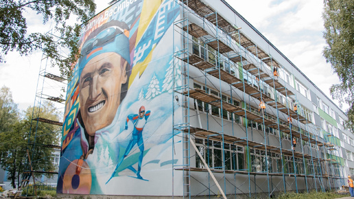 В Сыктывкаре на фасаде школы №38 завершается мурал о лыжнике Василии Рочеве-младшем