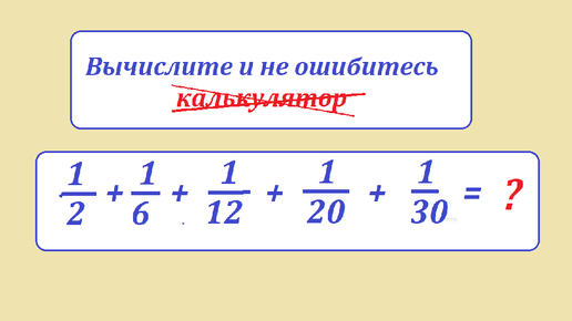 Просуммируйте эти дроби устно или хотя бы без калькулятора. 1/2 + 1/6 + 1/12 + 1/20 + 1/30