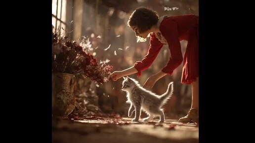 Котенок играет с девушкой и шалит