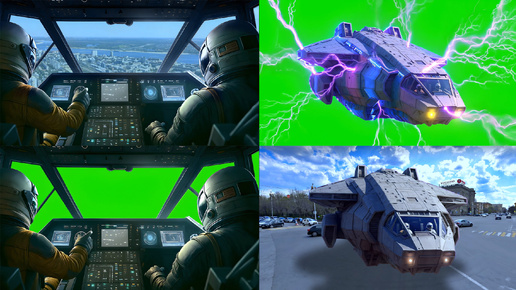 Футаж на зеленом фоне. Космический корабль. Виды внутри кабины и снаружи корабля. Хромакей.