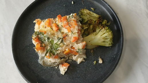 Навага под овощами с гарниром брокколи