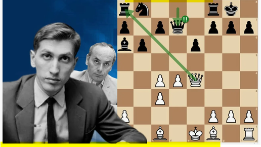 Черными играет Бобби Фишер, набирающий силу шахматный монстр, против Лайоша Портиша. Красивая игра будущего чемпиона в Санта-Монике, 1966