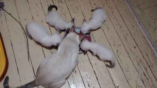 Котята завтракают миксом из мяса и птицы, очень им нравится