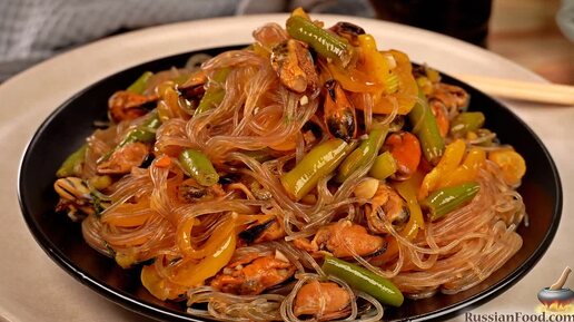 Морепродукты во вкусной компании. Салат с фунчозой, мидиями и овощами