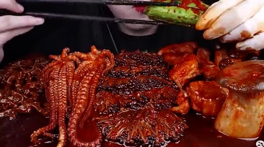 Лапша ASMR с черной фасолью, острые морепродукты, грибы эноки, осьминог, мукбанг.🐙🐙🍜