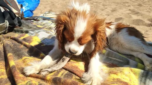 Щенок кавалер кинг чарльз спаниель носится по пляжу