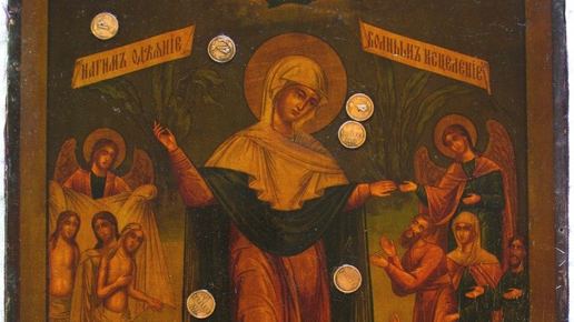Икона Божией Матери, именуемая Всех скорбящих Радость (с грошиками, 1888)