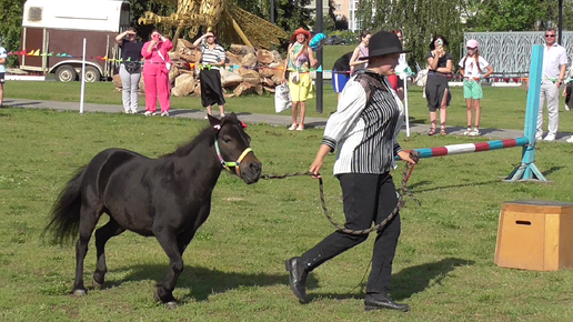 Женщина дрессировщица и чёрная лошадь пони