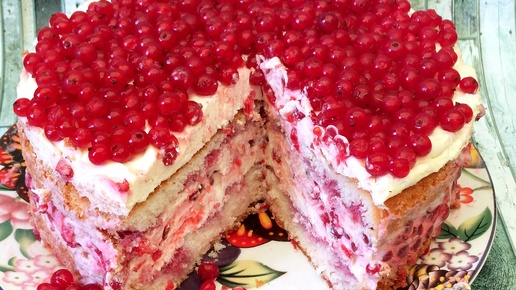 Бисквитный торт с кремом из сливочного творожного сыра и обилием красной смородины. Чудесный вкус и аромат.